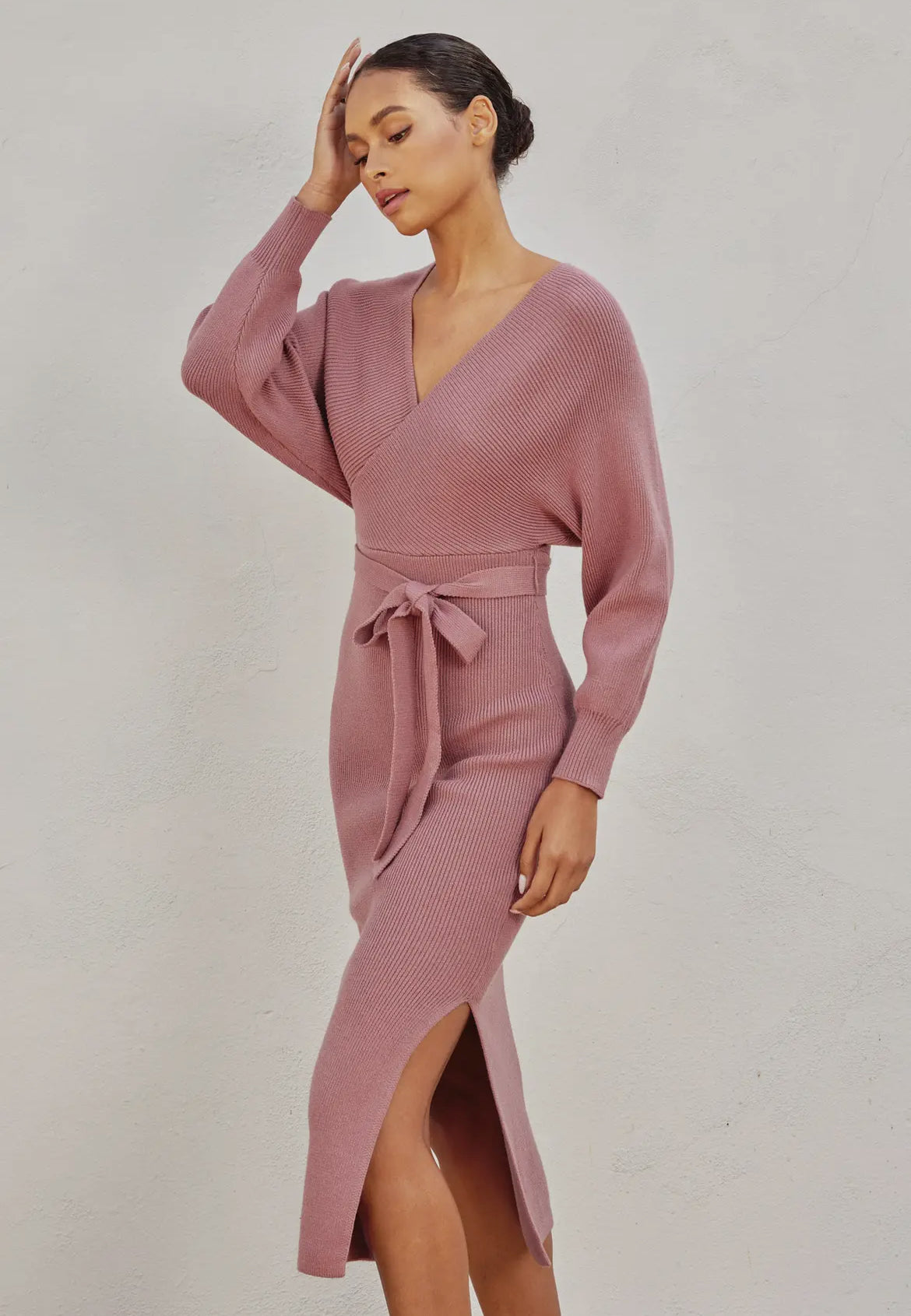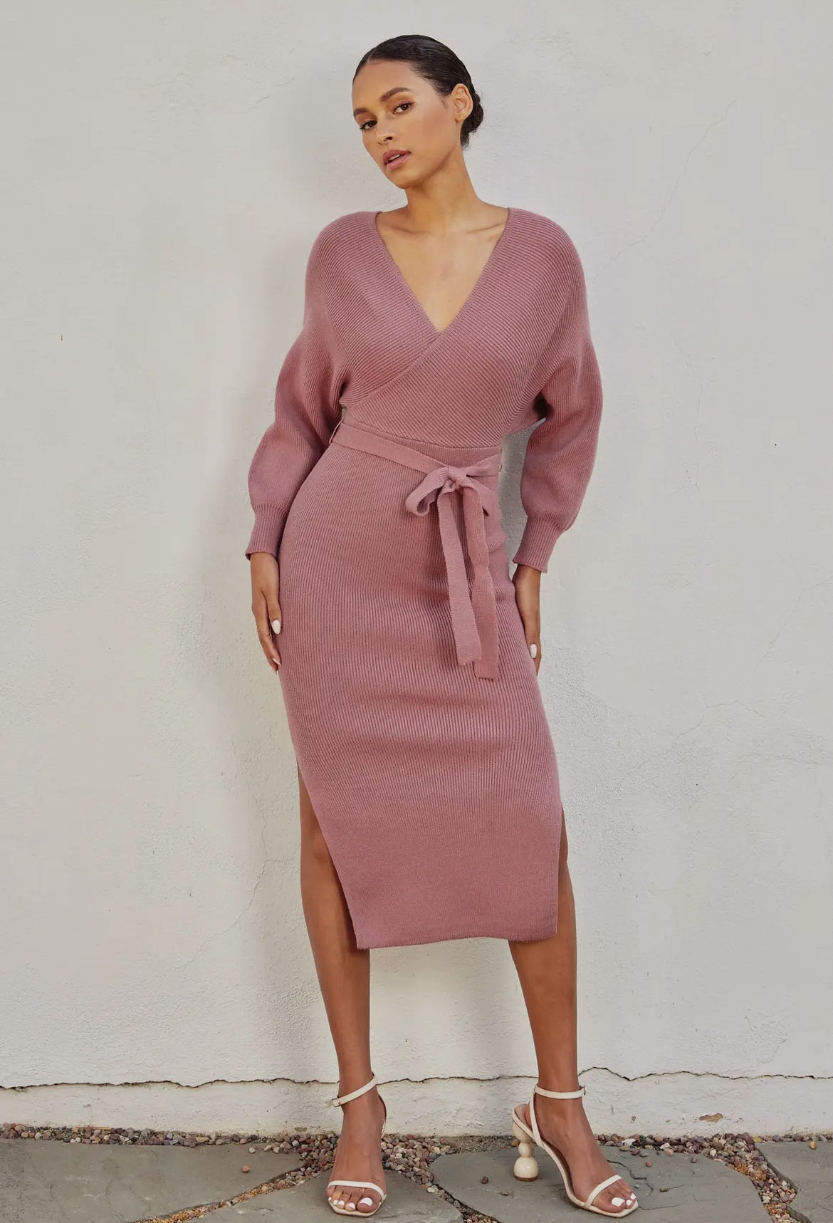 Elegant midi sweater dress. Model in other colors is 5'7" and Model in DRIED ROSE is 5'8". They are wearing size Small.