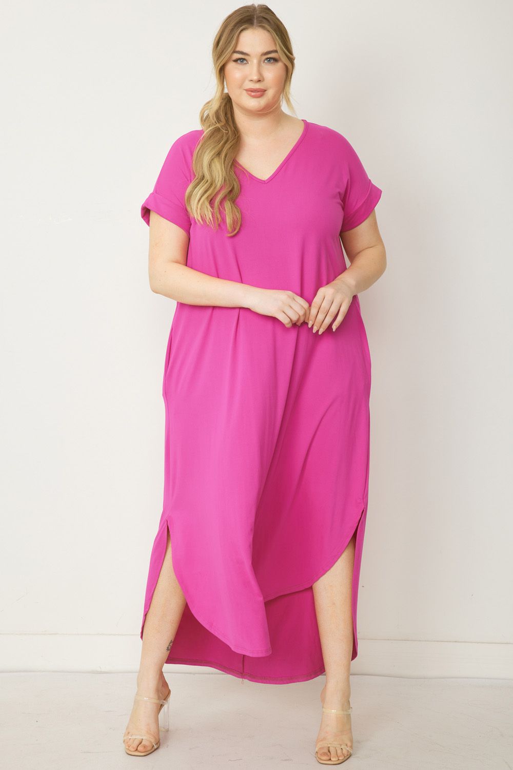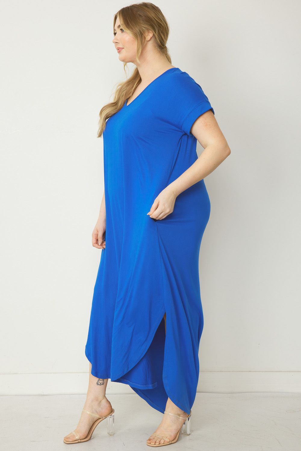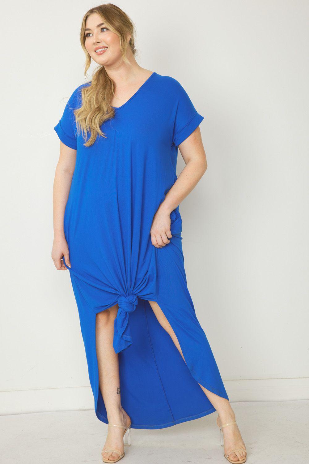 Jersey knit v-neck maxi dress featuring pocket detail at side. Permanent rolled sleeve. Rounded hem. Unlined.