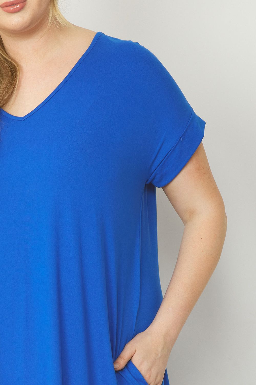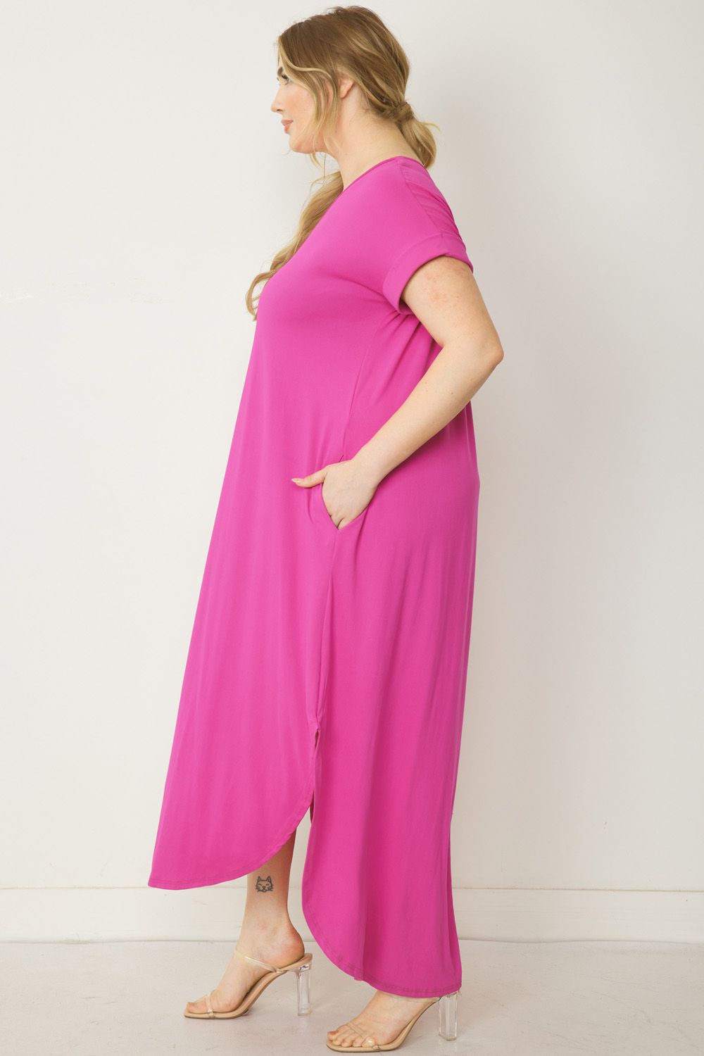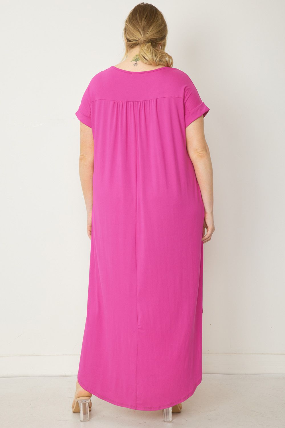 Jersey knit v-neck maxi dress featuring pocket detail at side. Permanent rolled sleeve. Rounded hem. Unlined.