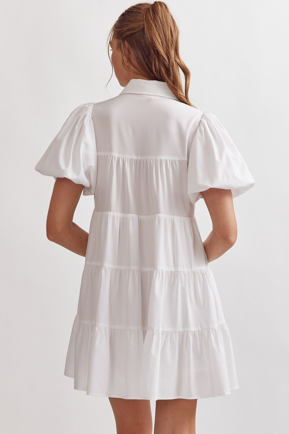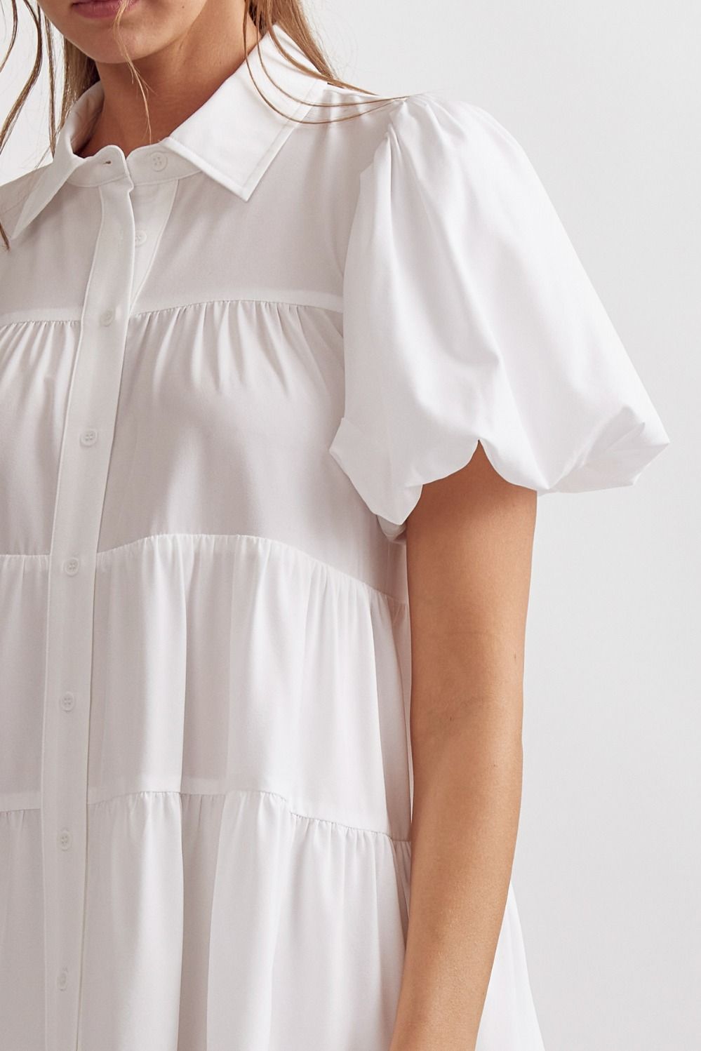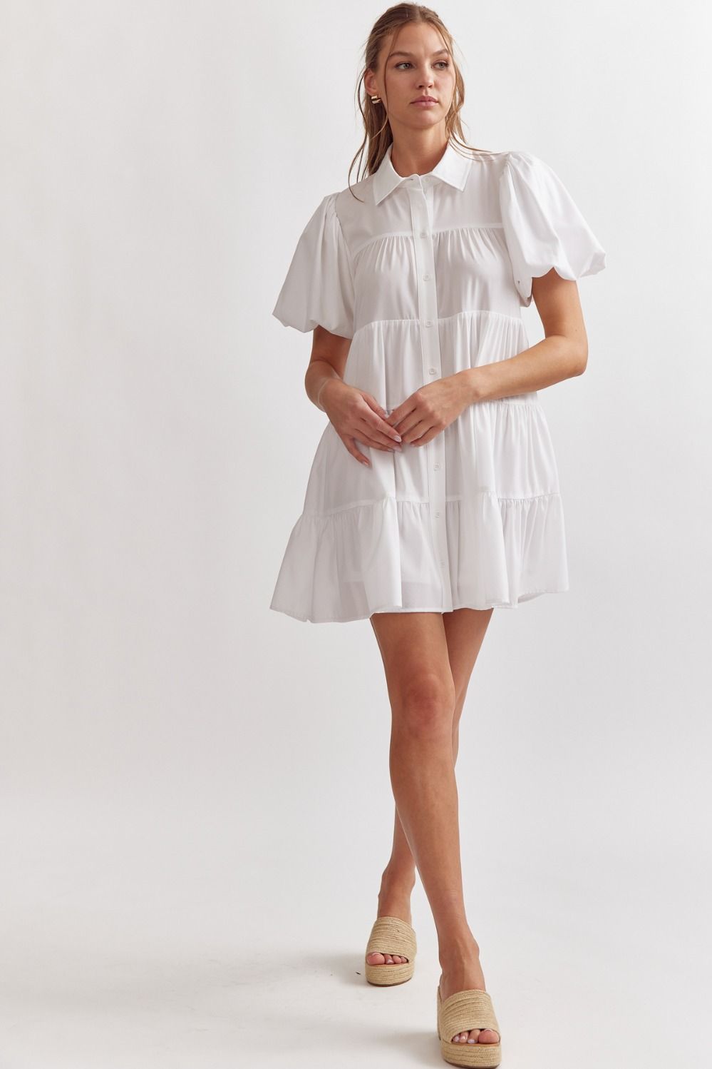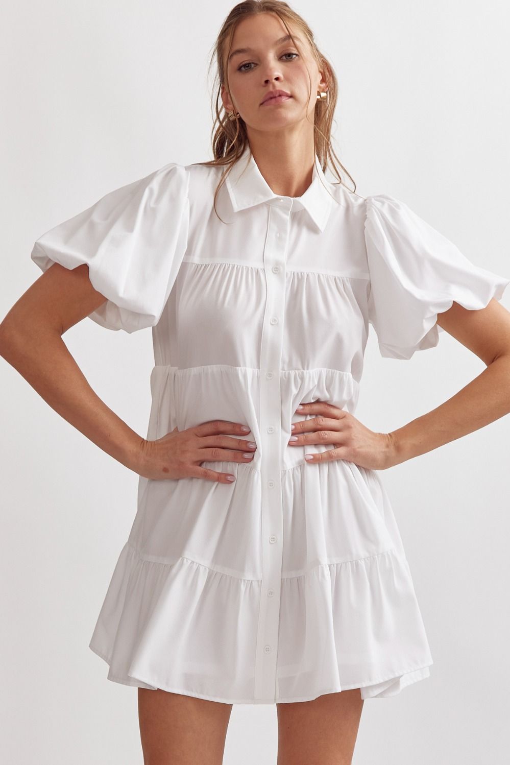Solid button up tiered mini dress featuring puff sleeves. Lined. Woven. Non-sheer. Lightweight.