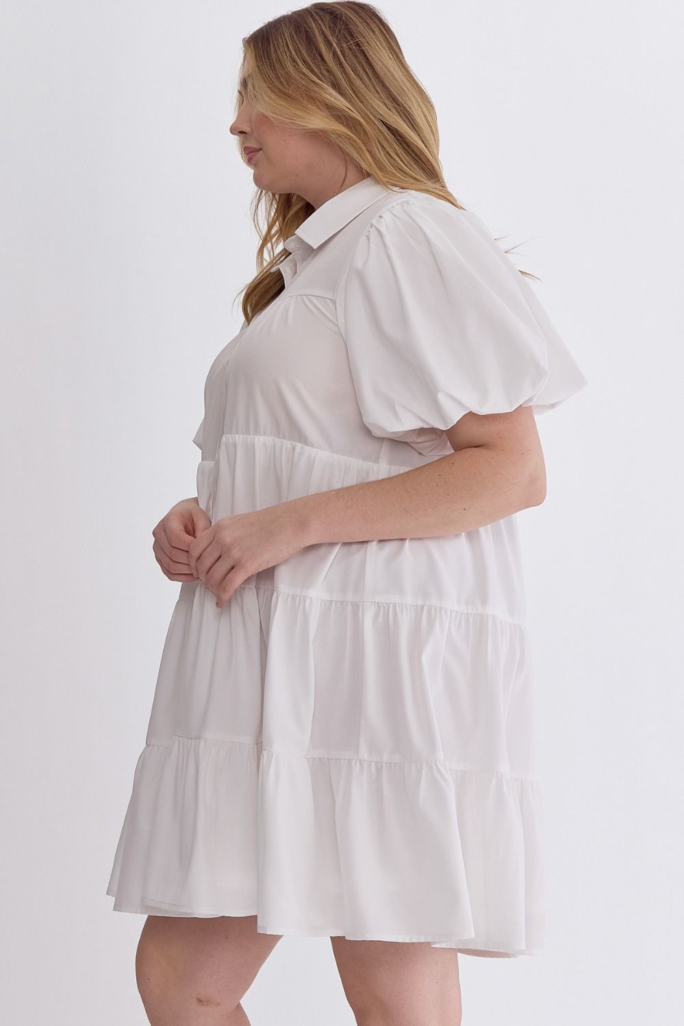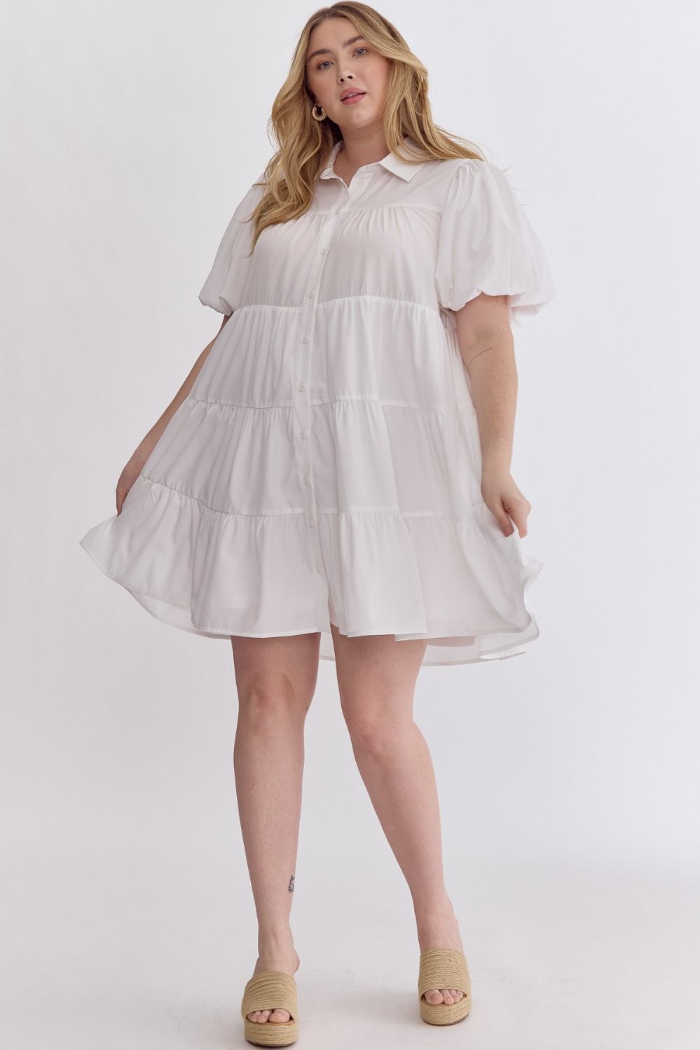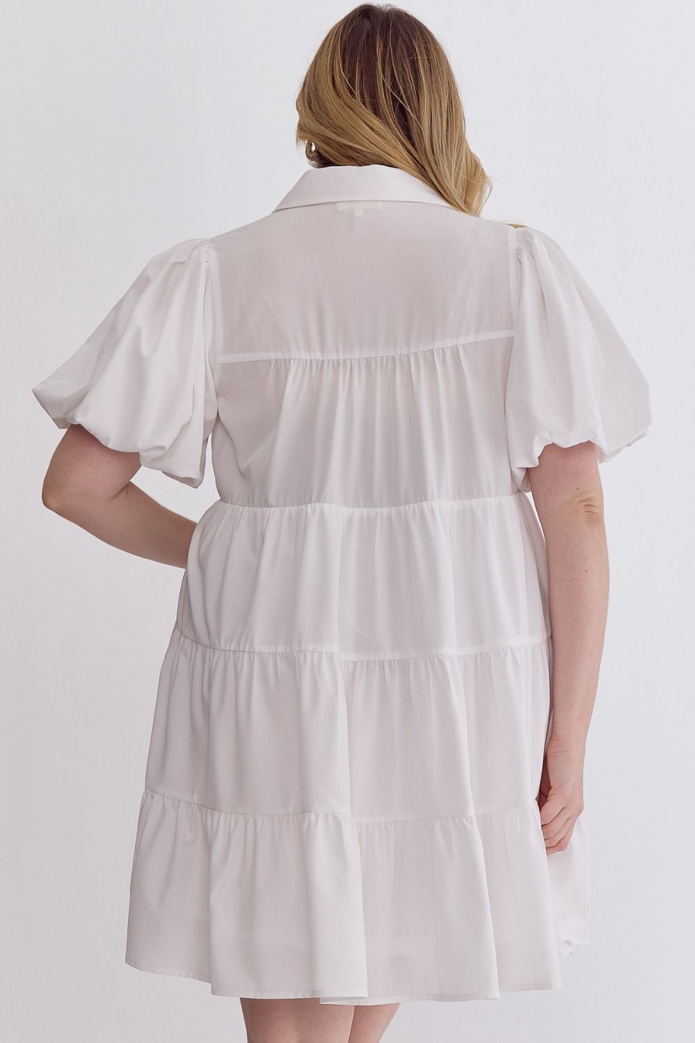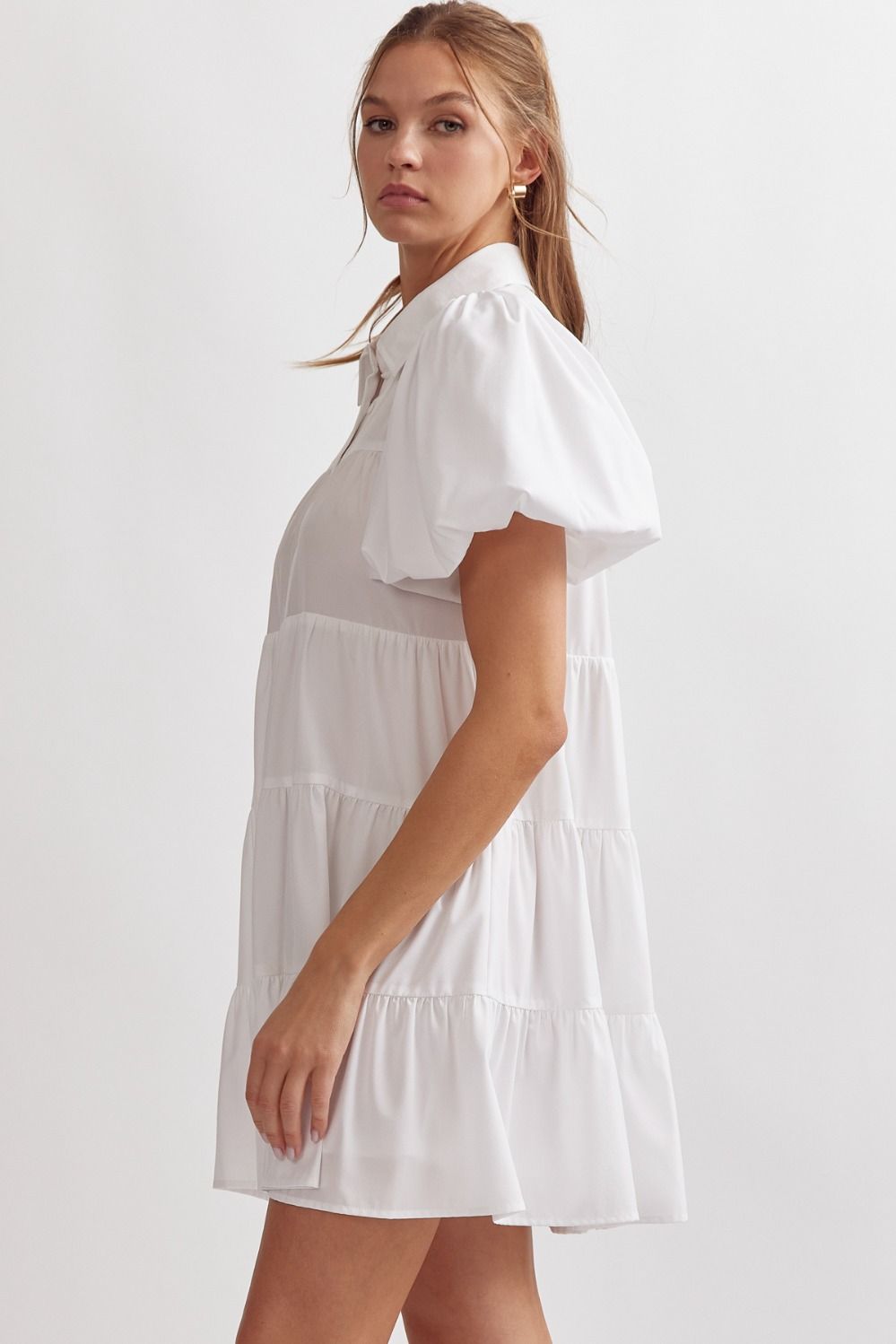 Solid button up tiered mini dress featuring puff sleeves. Lined. Woven. Non-sheer. Lightweight.