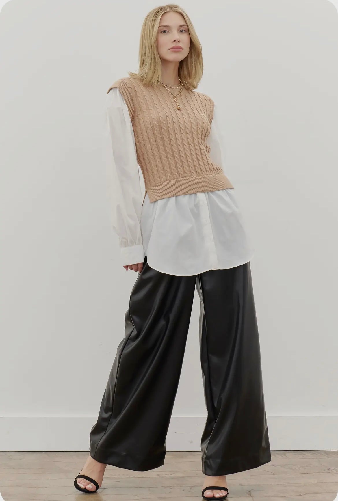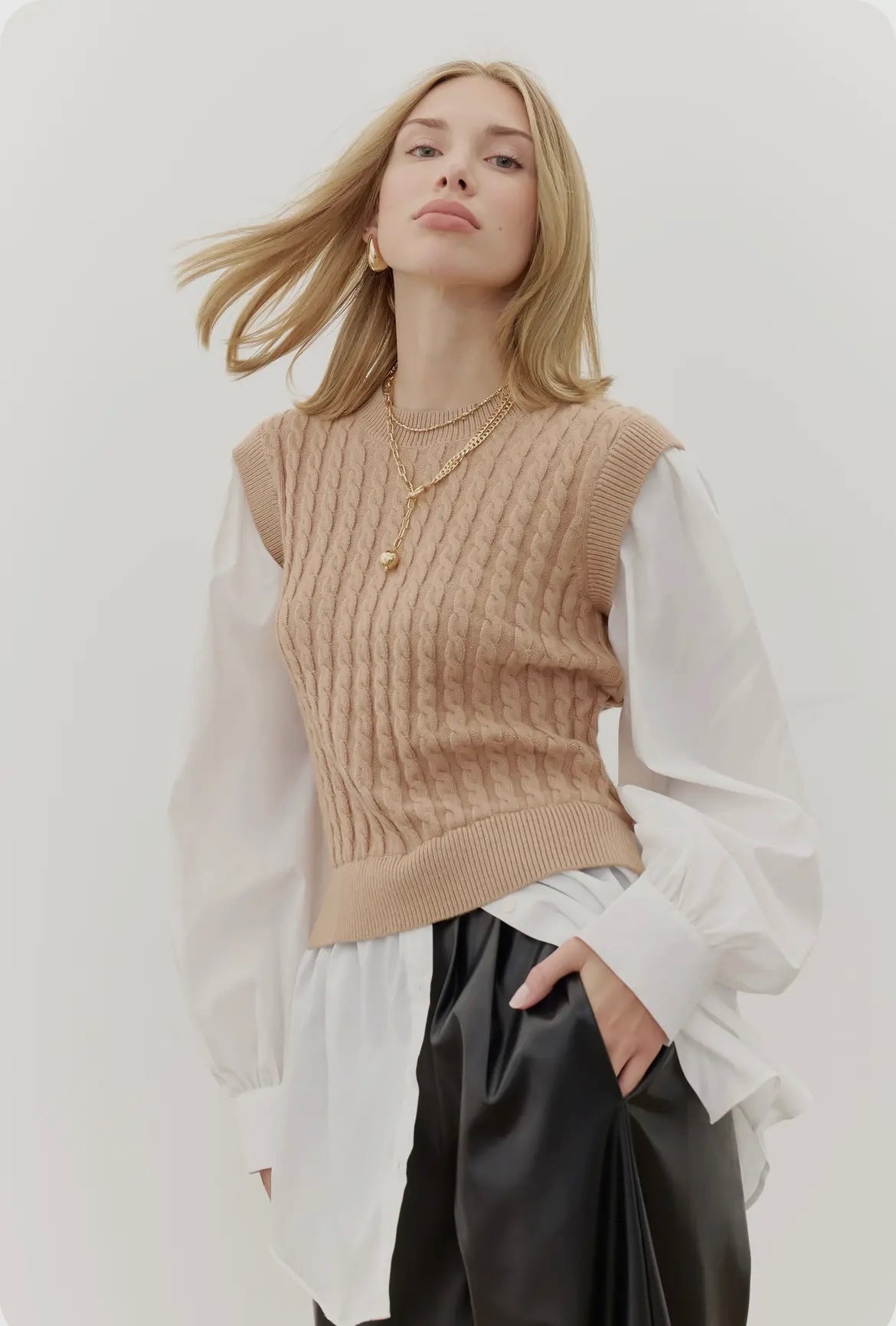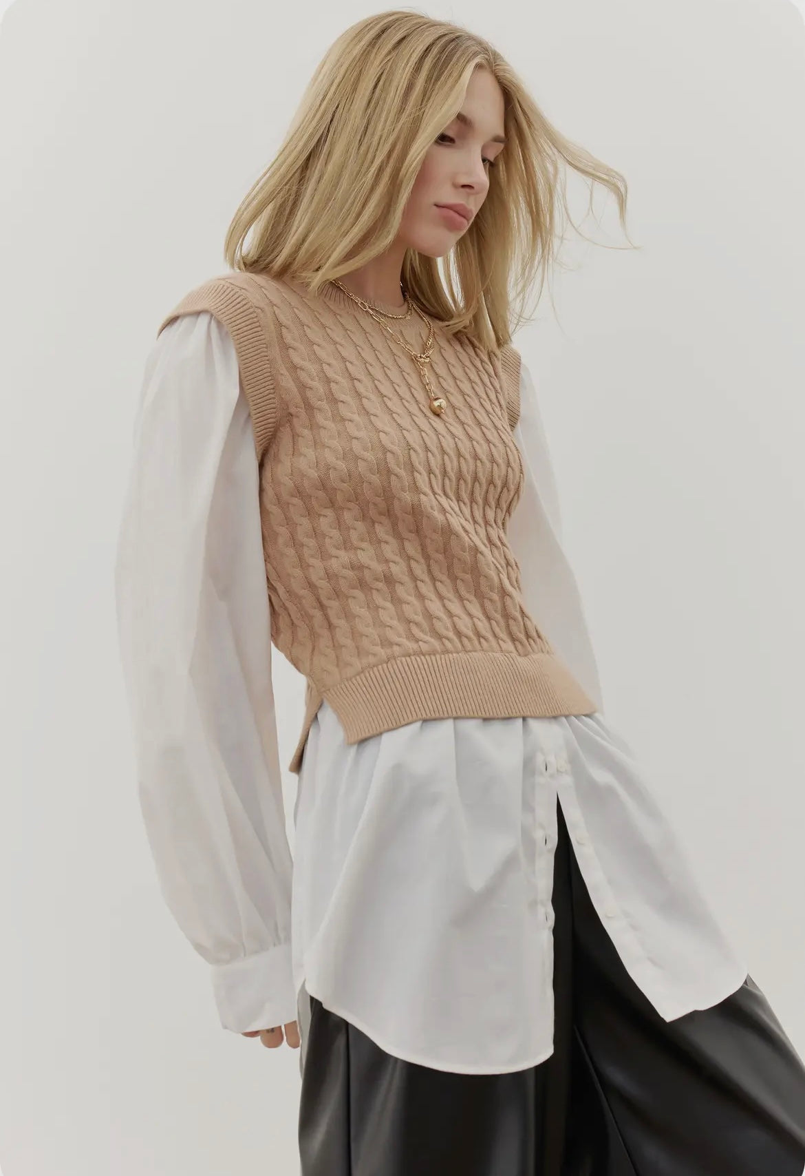 Mixed media shirt blouse in cable knit and poplin fabric. This pullover sweater shirt features a cable knit sweater bodice, contrast poplin fabric at sleeves/hem, long sleeve with button cuff, button down closure at front, and round neck.
