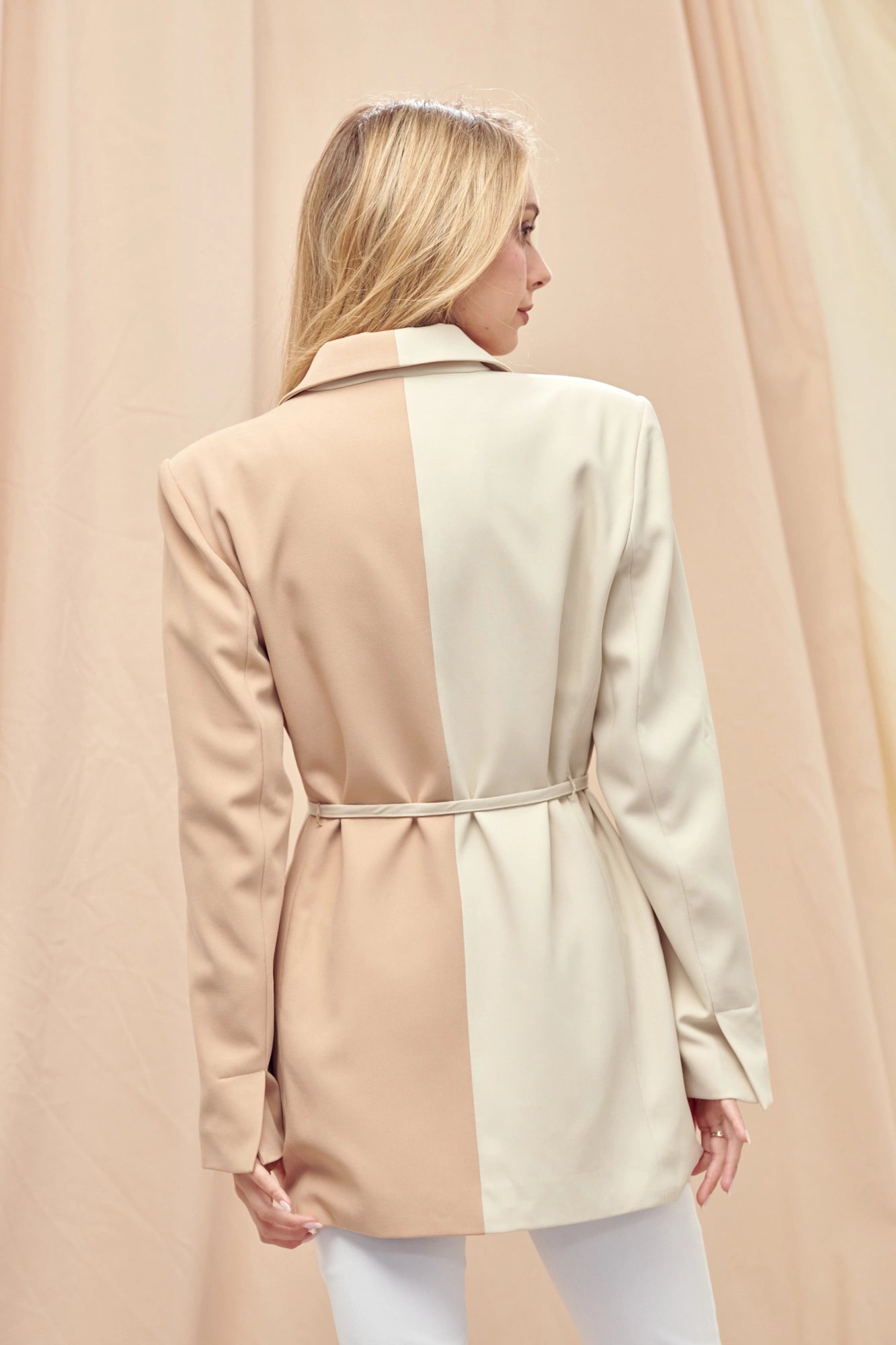 COLORBLOCK COLLAR & VEEP V NECK LIGHTLY PADDED SHOULDERS LONG SLEEVES THIN BELT DETAIL BLAZER, PADDED SHOULDERS, COLOR BLOCK BLAZER, SPRING BLAZER, SUMMER BLAZER, DRESSY, JACKETS,BUSINESS CASUAL.