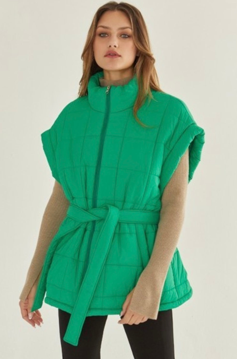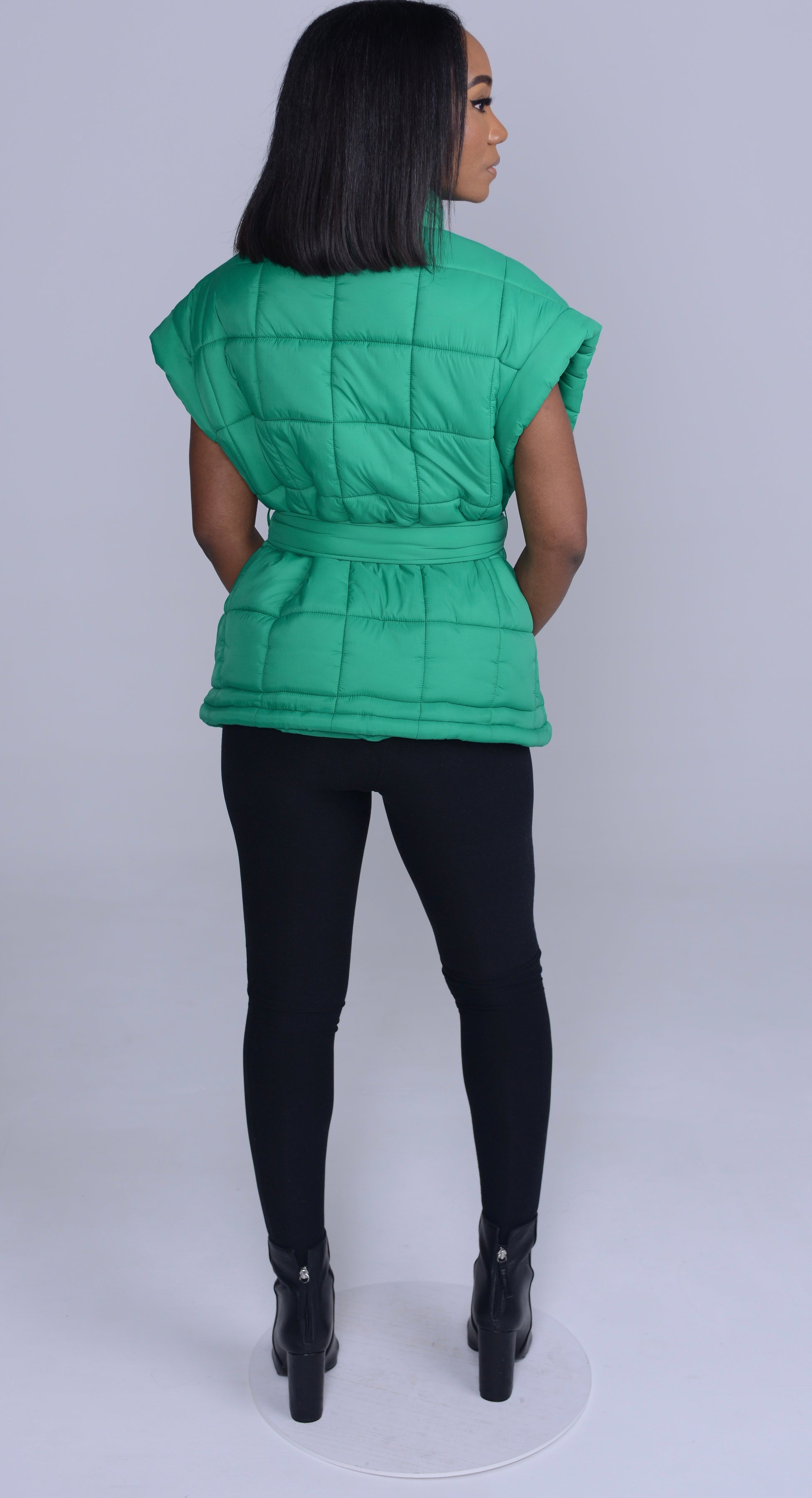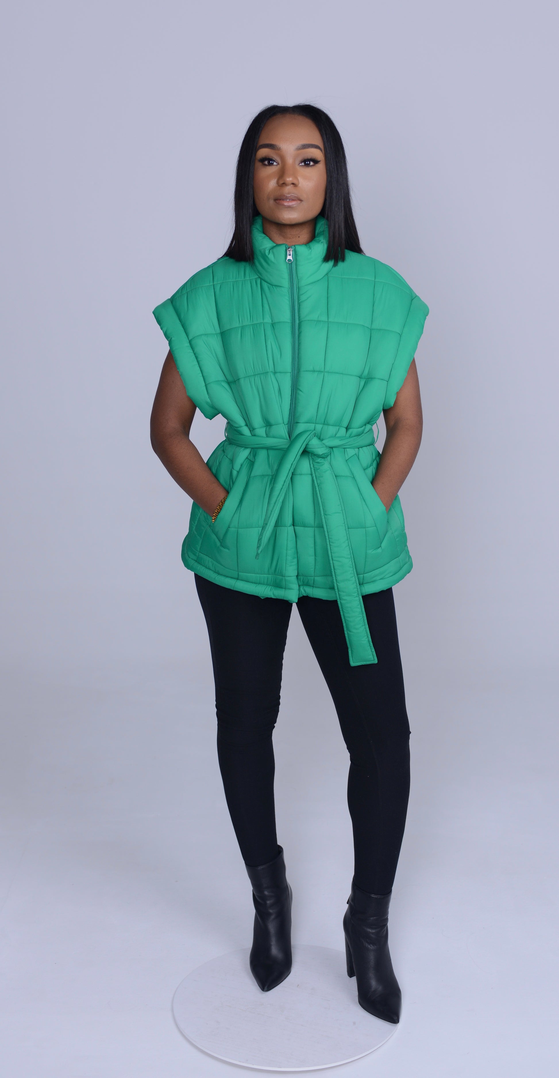Step out into nice weather in style with our Green Pretty Puffer Vest! This best-seller will keep you warm. What sets this vest apart is its show-stopping collar and modern cut. Comes with a belt for a modern and stylish silhouette.