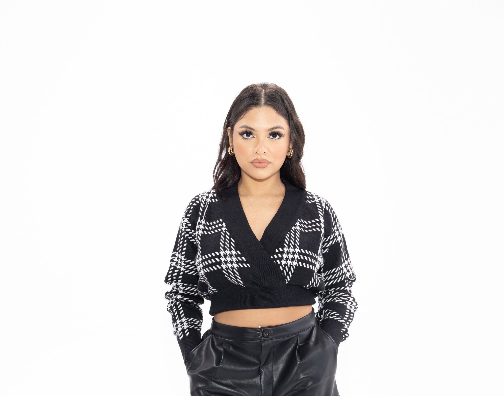 Plaid Surplice Sweater, 50% Viscose, 28% Poly, 22% Nylon,