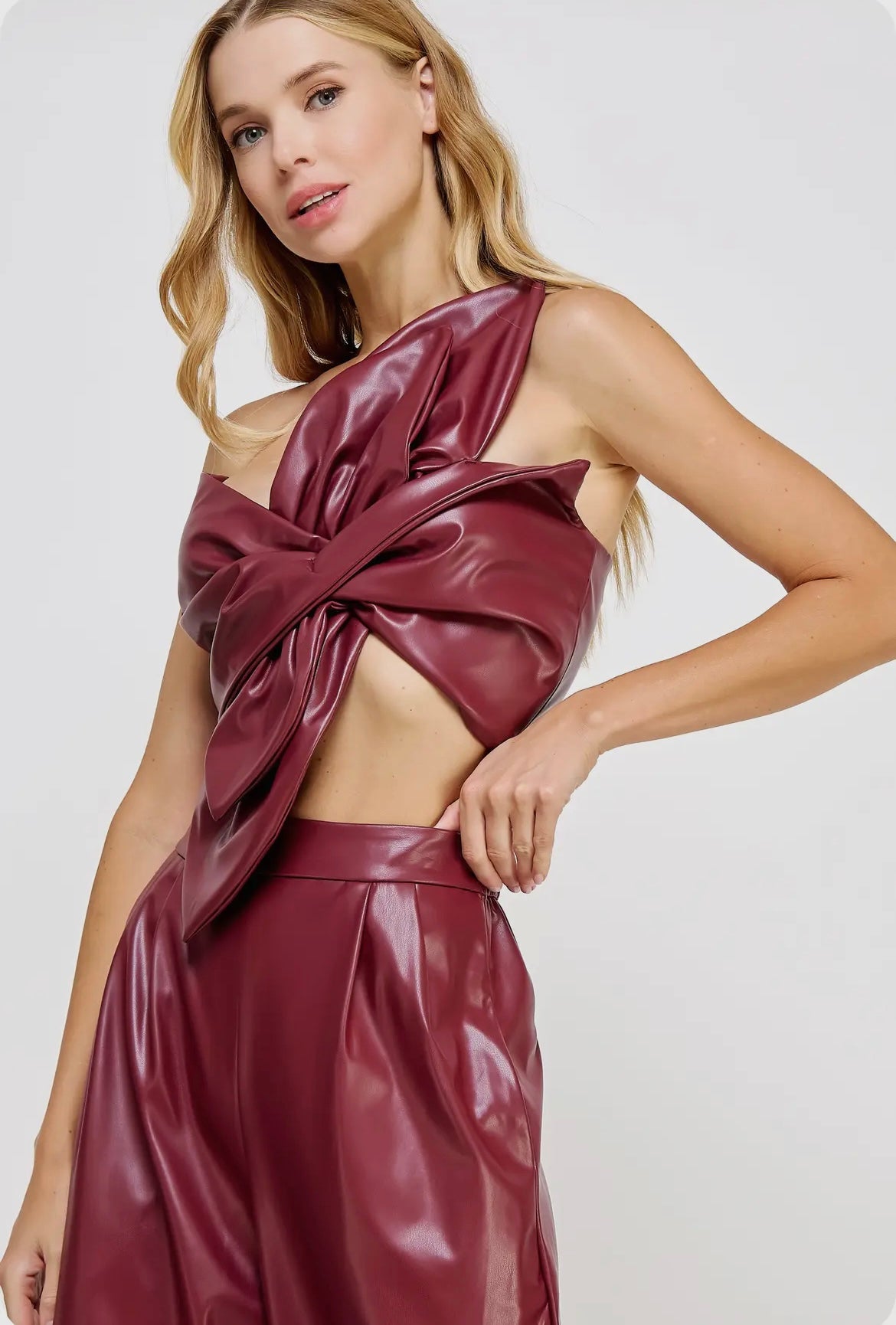 One-Shoulder Knotted Twist Faux Leather Crop Top