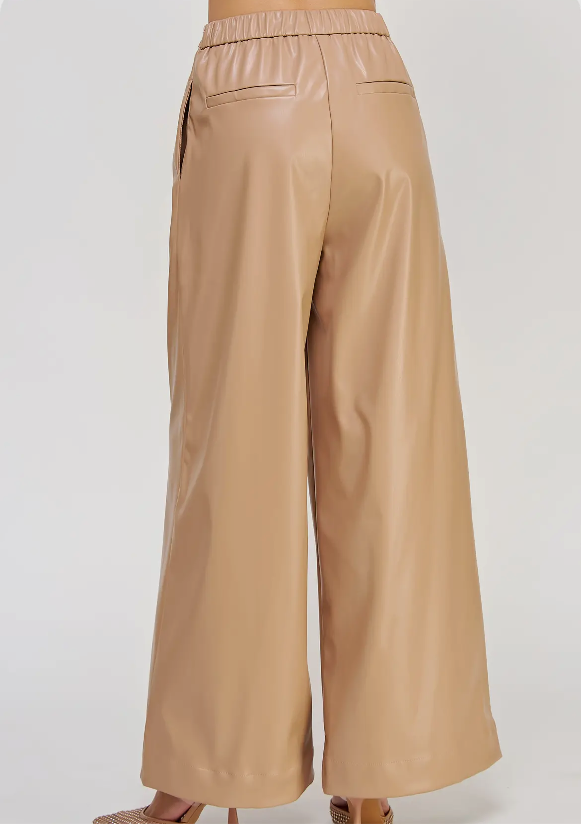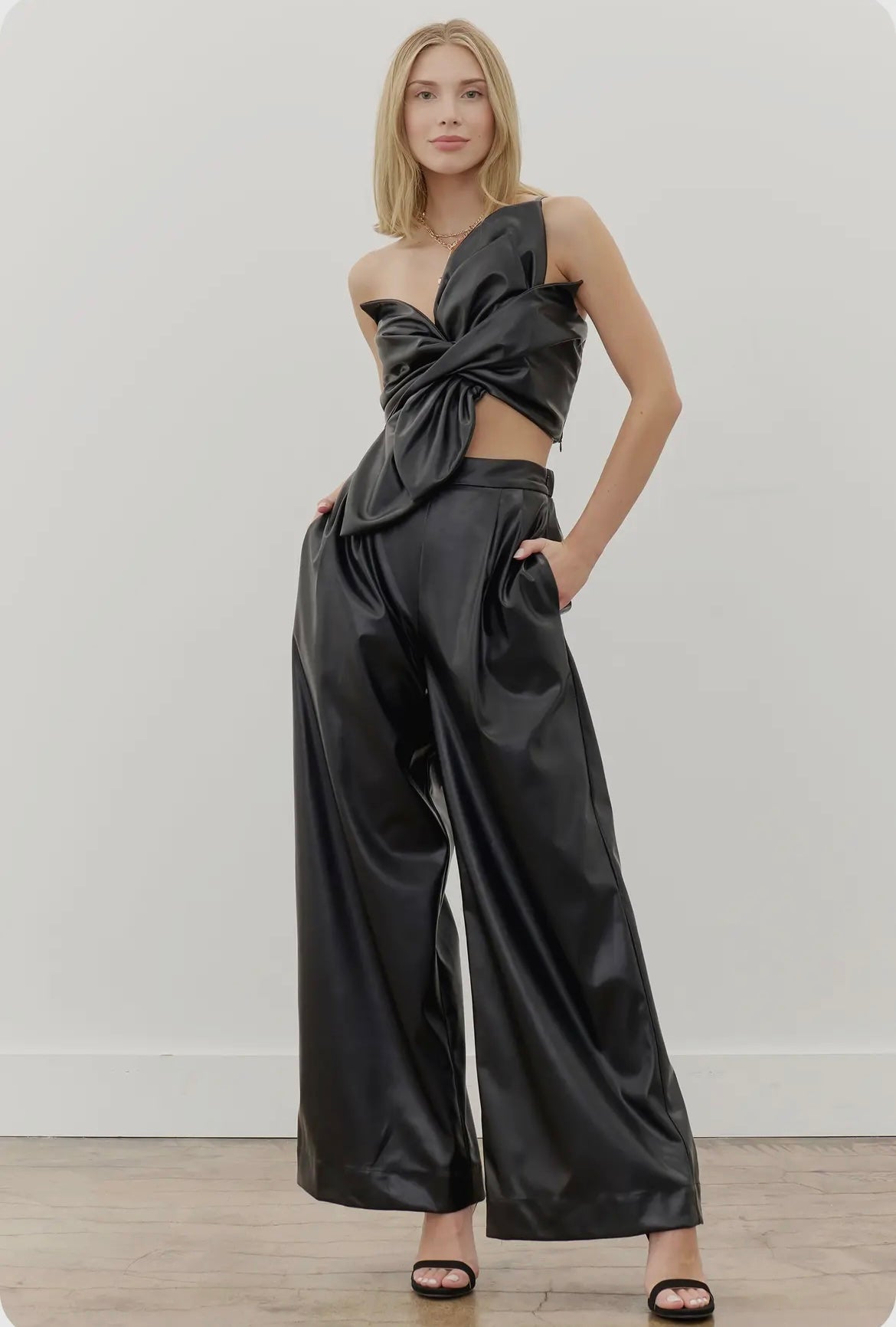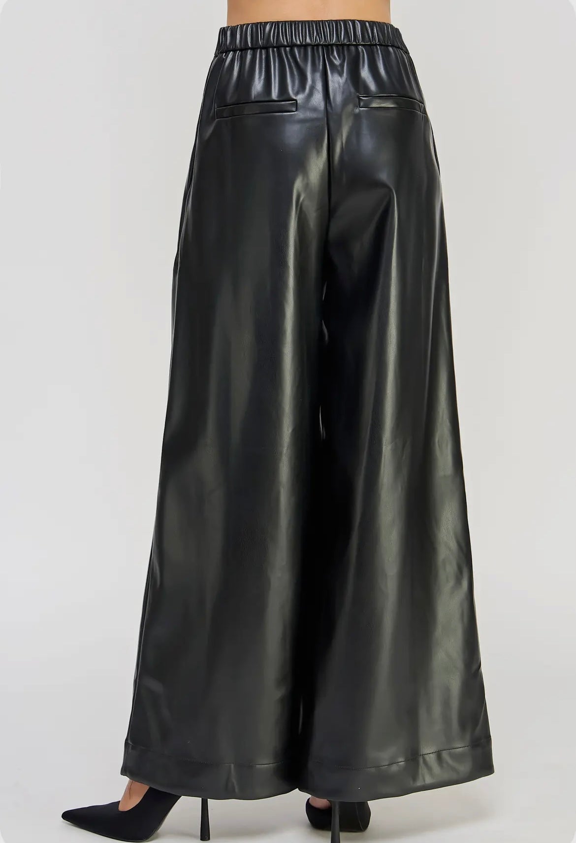Pleated Detail Wide Leg Pants in stretch faux leather fabric. This pair of trouser feature wide palazzo legs, side pockets, elasticated waist at back, a hidden side zipper closure, half lining, and two back welt pockets. It can be made into a set with top